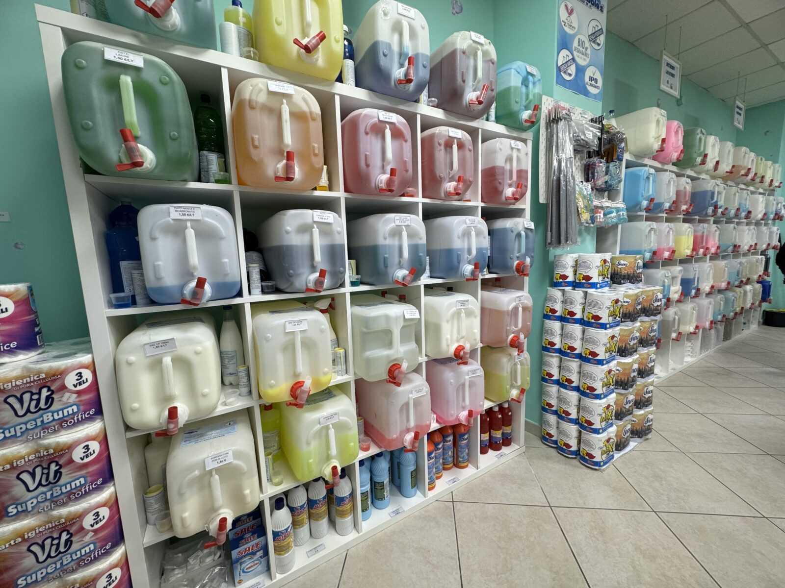 I clienti possono portare i propri contenitori da casa oppure utilizzare taniche, bottiglie e flaconi che il negozio recupera grazie alle collaborazioni con alcune attività della zona, che forniscono contenitori destinati al riciclo. Parliamo di bottiglie di latte, acqua o bibite per intenderci.