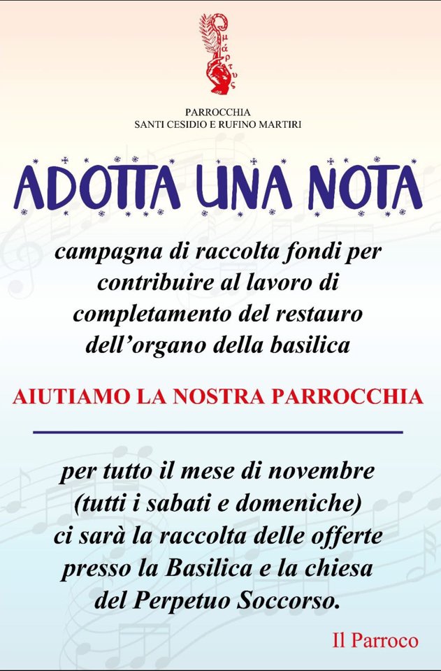 Per tutto il mese di novembre, ogni sabato e domenica, sarà possibile contribuire con un’offerta presso la Basilica e la chiesa del Perpetuo Soccorso. L’obiettivo è creare una mobilitazione partecipata e concreta, trasformando ogni donazione in una “nota” capace di riportare allo splendore uno strumento simbolo della tradizione locale.