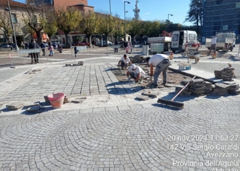 Avezzano. Operai al lavoro in piazza Risorgimento per sistemare delle porzioni di pavimentazione danneggiate nel tempo. Come già annunciato nei...
