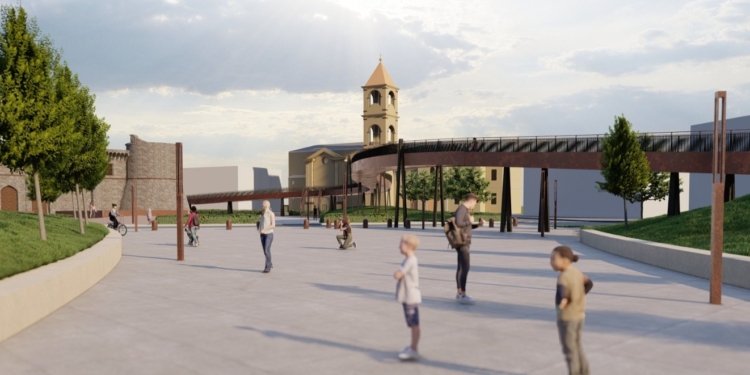 In particolare, il progetto interviene su una vasta porzione di città creando un nuovo sistema ciclopedonale che unisce piazza Torlonia, piazza Castello e piazza San Bartolomeo. Ulteriore elemento di connessione, dello spazio e del tempo, è la “passerella ciclopedonale”, un vero e proprio ponte tra passato e futuro che si innalza dolcemente dalla nuova piazza che sorge sull’area dell’Ex Omni adiacente al Parco Torlonia estendendosi come un “nastro morbido” fino a scendere a piazza Castello. Da qui il percorso ciclopedonale prosegue a quota terra percorrendo via Vidimari e via Orazio Mattei, nella loro nuova forma riqualificata, fino ad arrivare al Parco Torlonia dove è prevista una recinzione perimetrale dell’area verde.