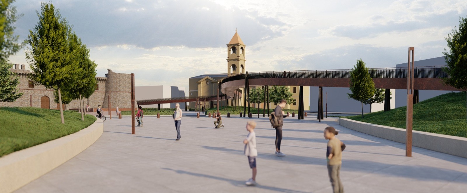 In particolare, il progetto interviene su una vasta porzione di città creando un nuovo sistema ciclopedonale che unisce piazza Torlonia, piazza Castello e piazza San Bartolomeo. Ulteriore elemento di connessione, dello spazio e del tempo, è la “passerella ciclopedonale”, un vero e proprio ponte tra passato e futuro che si innalza dolcemente dalla nuova piazza che sorge sull’area dell’Ex Omni adiacente al Parco Torlonia estendendosi come un “nastro morbido” fino a scendere a piazza Castello. Da qui il percorso ciclopedonale prosegue a quota terra percorrendo via Vidimari e via Orazio Mattei, nella loro nuova forma riqualificata, fino ad arrivare al Parco Torlonia dove è prevista una recinzione perimetrale dell’area verde.