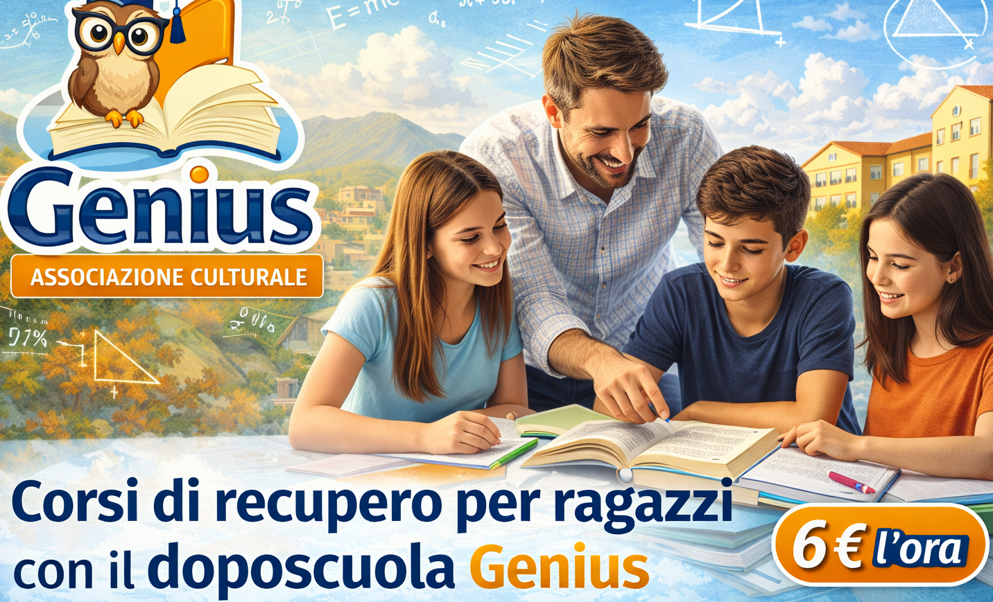 Studiare con serenità, migliorare il rendimento scolastico e acquisire un metodo di studio efficace: sono questi gli obiettivi del doposcuola Genius, associazione culturale attiva ad Avezzano e rivolta agli studenti di scuola primaria, secondaria di primo grado, licei e istituti tecnici. Genius propone doposcuola, aiuto compiti e ripetizioni collettive a un costo accessibile di 6 € l’ora, offrendo un servizio strutturato e seguito da personale qualificato ed abilitato all’insegnamento.