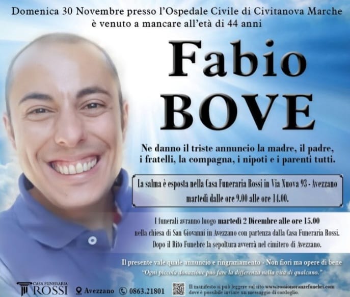 Avezzano. Una terribile notizia ha scosso la comunità di Avezzano nella giornata di oggi: è venuto a mancare, a soli 44 anni, Fabio Bove, figura molto conosciuta e stimata nella Marsica. Bove si è spento all’ospedale civile di Civitanova Marche, dove era ricoverato.
