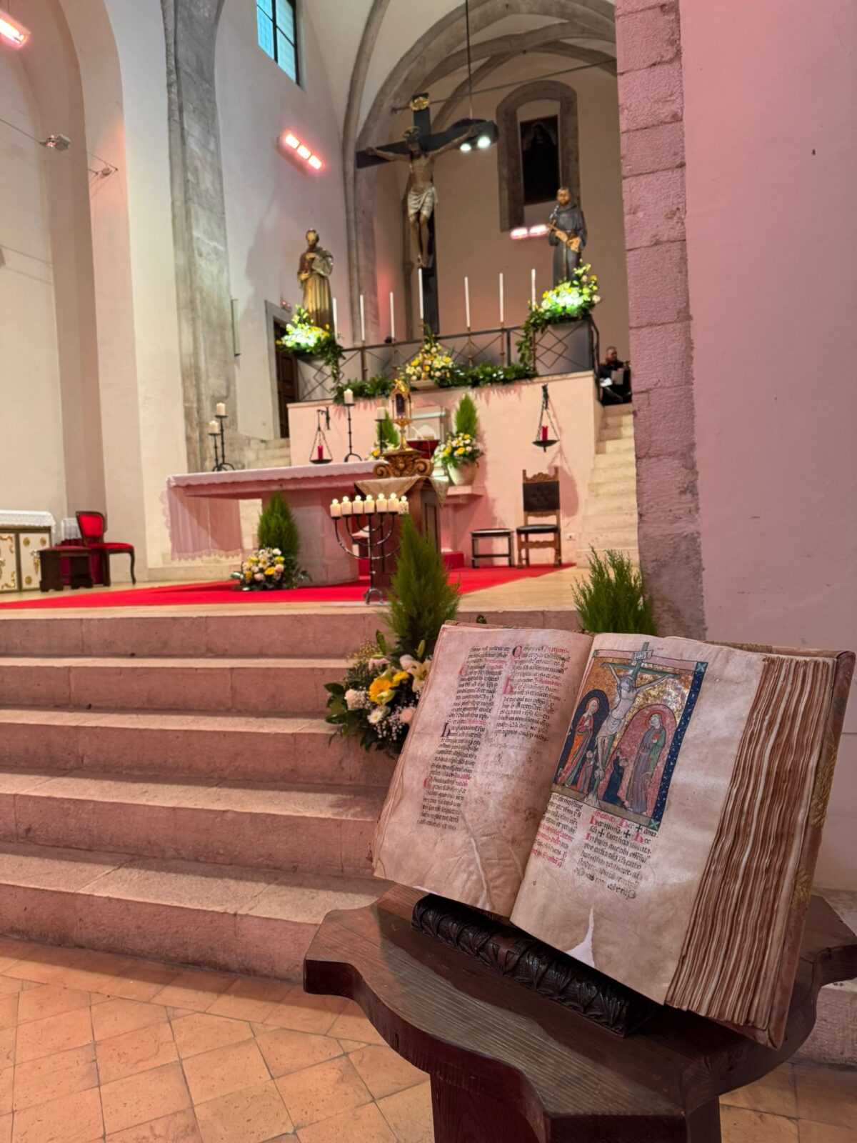 Al termine della Santa Messa, dopo la magistrale esecuzione del Cantico delle Creature da parte del Coro, il Vescovo ha letto la preghiera composta per l’occasione da Papa Leone e ha impartito la benedizione finale con l’insigne Reliquia delle ceneri e del saio di San Francesco. Per l’occasione è stato esposto alla venerazione anche il messale del Beato Tommaso, opera in pergamena miniata del XIII secolo.