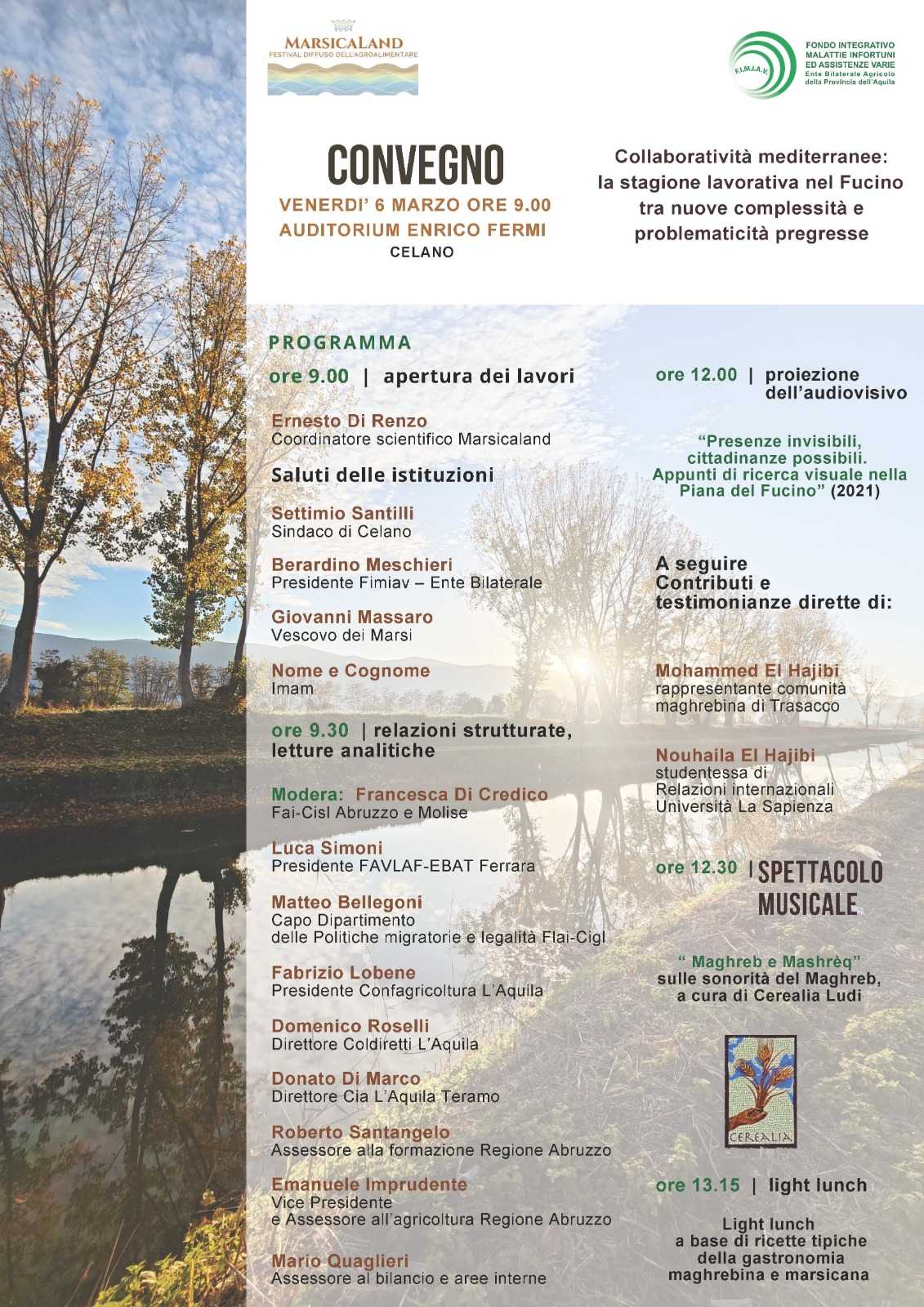 Celano. Venerdì 6 marzo 2026, a partire dalle ore 9, a Celano Auditorium Enrico Fermi ospiterà il convegno “Collaboratività mediterranee. La stagione lavorativa nel Fucino tra nuove complessità e problematicità pregresse”, promosso da FIMIAV – Ente Bilaterale agricolo della provincia dell’Aquila e MARSICALAND – Festival diffuso dell’agroalimentare.