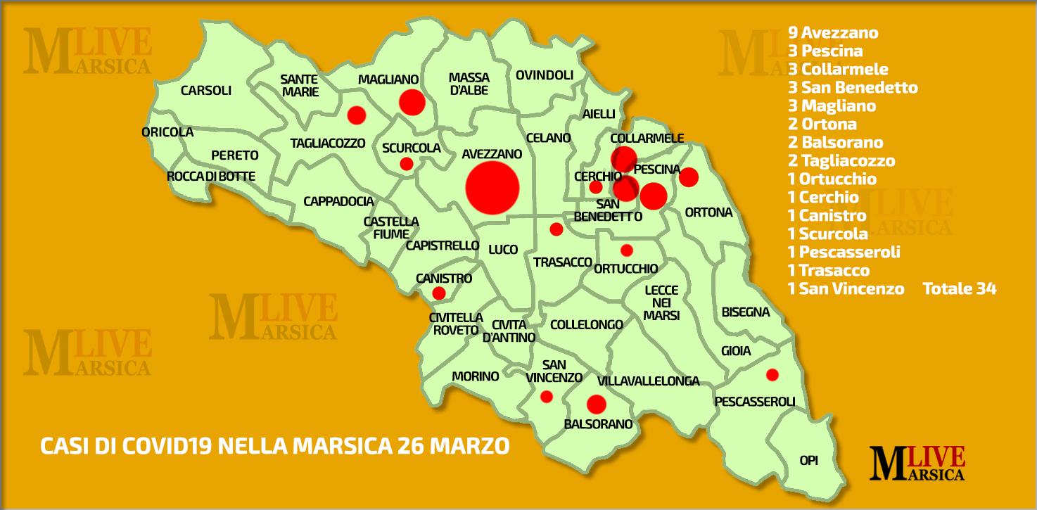 I nuovi casi si registrano ad Avezzano con due persone contagiate che fanno salire il numero in città a 7, a Ortucchio dove un uomo di 58 anni è risultato il primo positivo del paese avendo eseguito il tampone dopo una settimana di febbre, e una persona di Magliano che lavora in una grande azienda di Avezzano.