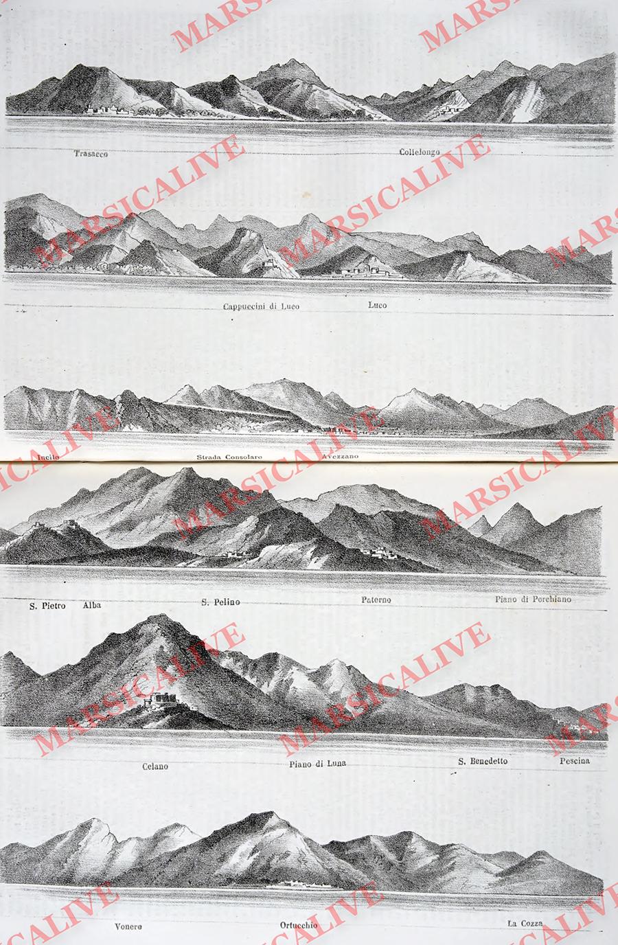 La terza immagine, in realtà una serie di immagini, colpiscono per originalità. Si tratta di sei illustrazioni panoramiche, che se ricollegate tra loro, danno vita a una vista a 360° della conca fucense, con il panorama che si poteva osservare tutt’intorno dal centro del lago e didascalie paese per paese. Oggi basta un qualsiasi smartphone per creare delle coinvolgenti foto panoramiche, ma grazie alla brillante e originale intuizione dell’autore, anche noi possiamo godere di una fantastica panoramica fucense a distanza di oltre centosessant’anni.