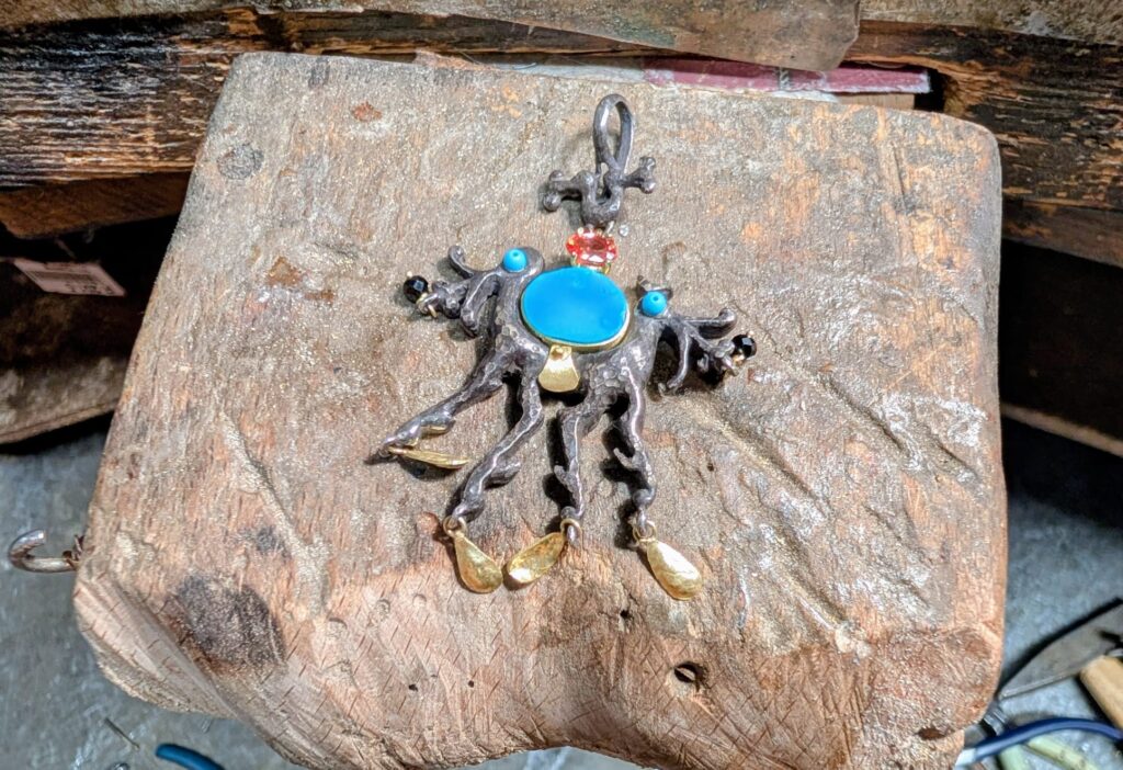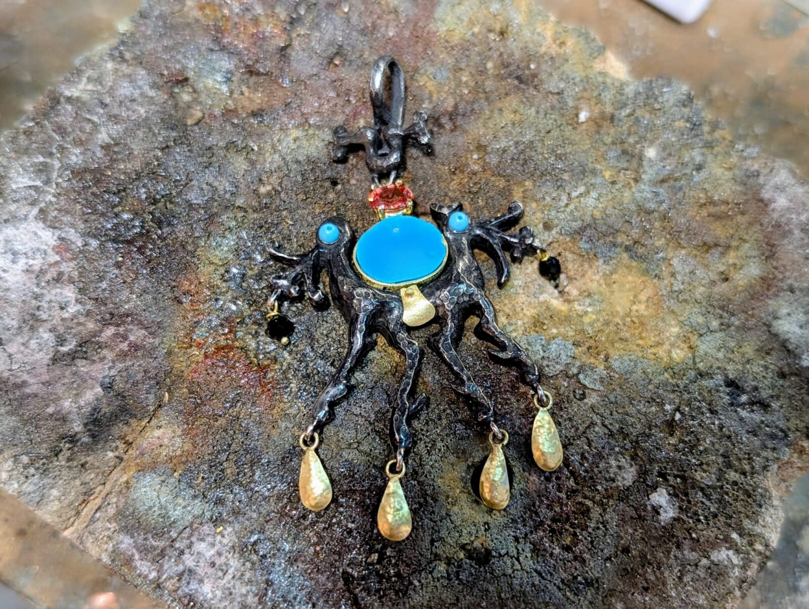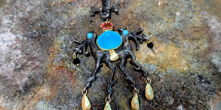 La forma è ancestrale. Il metallo scuro e irregolare sembra corroso dai millenni, appena “pescato” dal fondo di un lago che non c’è più. Al centro domina un turchese intenso: è l’occhio dell’acqua, il ricordo del lago Fucino. Sopra di esso, una pietra dalle sfumature calde evoca il fuoco o la vita pulsante della città perduta. Tre gocce d’oro scivolano verso il basso, come lacrime preziose o tesori scampati al disastro.