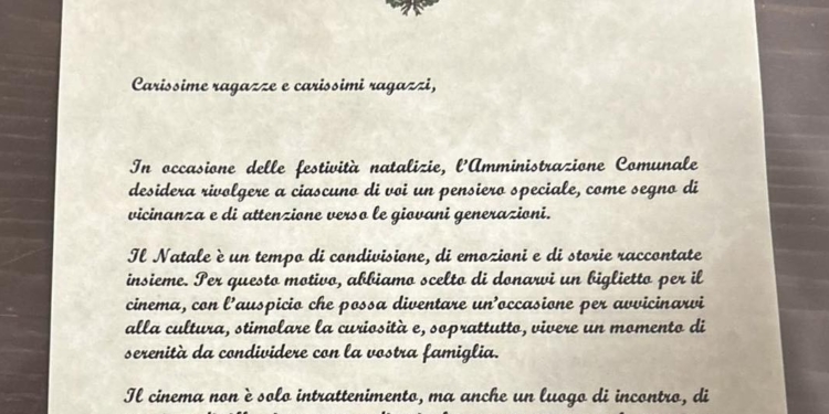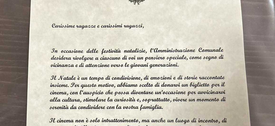 Un piccolo ma significativo gesto per celebrare il Natale e sostenere i più giovani: il Comune di Ortucchio ha scelto di omaggiare gli studenti del territorio con un biglietto per il cinema, un’iniziativa pensata per regalare un momento di svago e cultura e rafforzare il legame tra l’amministrazione comunale e la comunità scolastica.