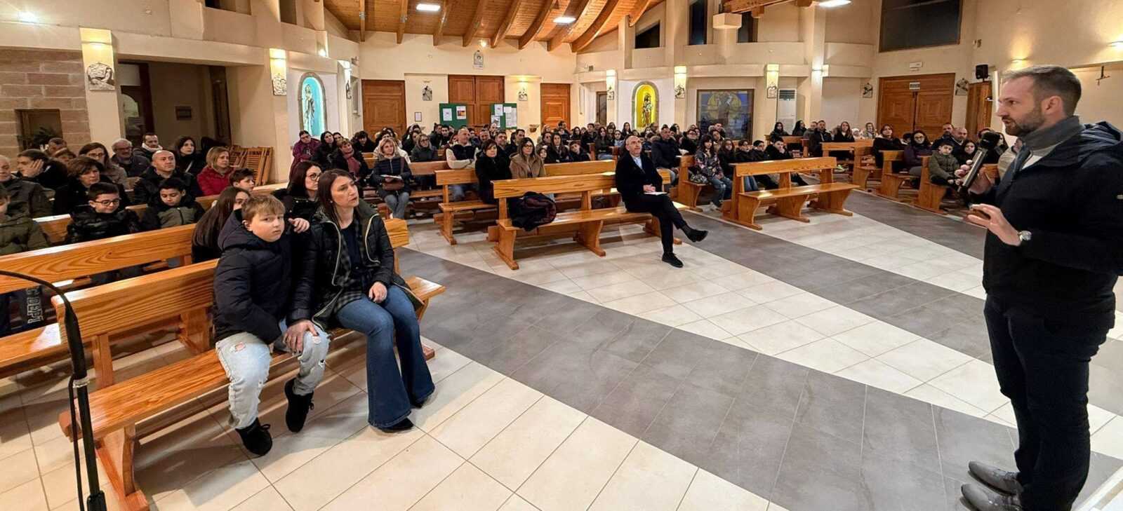 Avezzano. Un momento di ascolto, dialogo e condivisione ha riunito giovedì sera le famiglie dei bambini e dei ragazzi che si preparano a ricevere la Prima Comunione e la Cresima. Nella chiesa di Caruscino, genitori e figli delle comunità di Caruscino e San Pelino hanno partecipato a un incontro guidato dal vescovo Monsignor Giovanni Massaro, occasione per riflettere insieme sul cammino di fede e sul ruolo educativo di famiglia, scuola e Chiesa nella crescita dei più giovani.