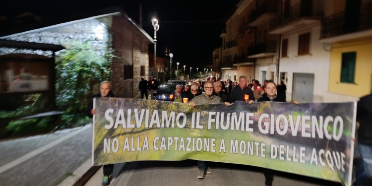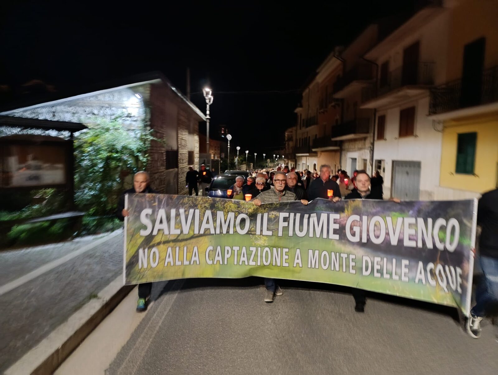 Pescina. Grande adesione e forte partecipazione ieri sera per la fiaccolata a difesa del fiume Giovenco. La comunità di Pescina si è mobilitata in massa per protestare contro il progetto di captazione delle acque, parte del piano per l’impianto irriguo del Fucino.