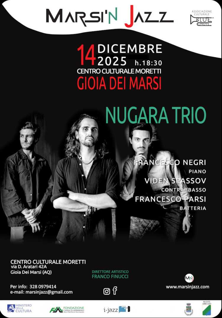 Gioia dei Marsi. Nell’ambito del calendario degli eventi “Natale con Gioia”, il Comune di Gioia dei Marsi propone un nuovo appuntamento dedicato alla musica di qualità e alla valorizzazione culturale del territorio. Domenica 14 dicembre, alle ore 18.30, il Centro culturale Moretti ospiterà il concerto del Nugara Trio, inserito nel cartellone di Marsi’n Jazz.