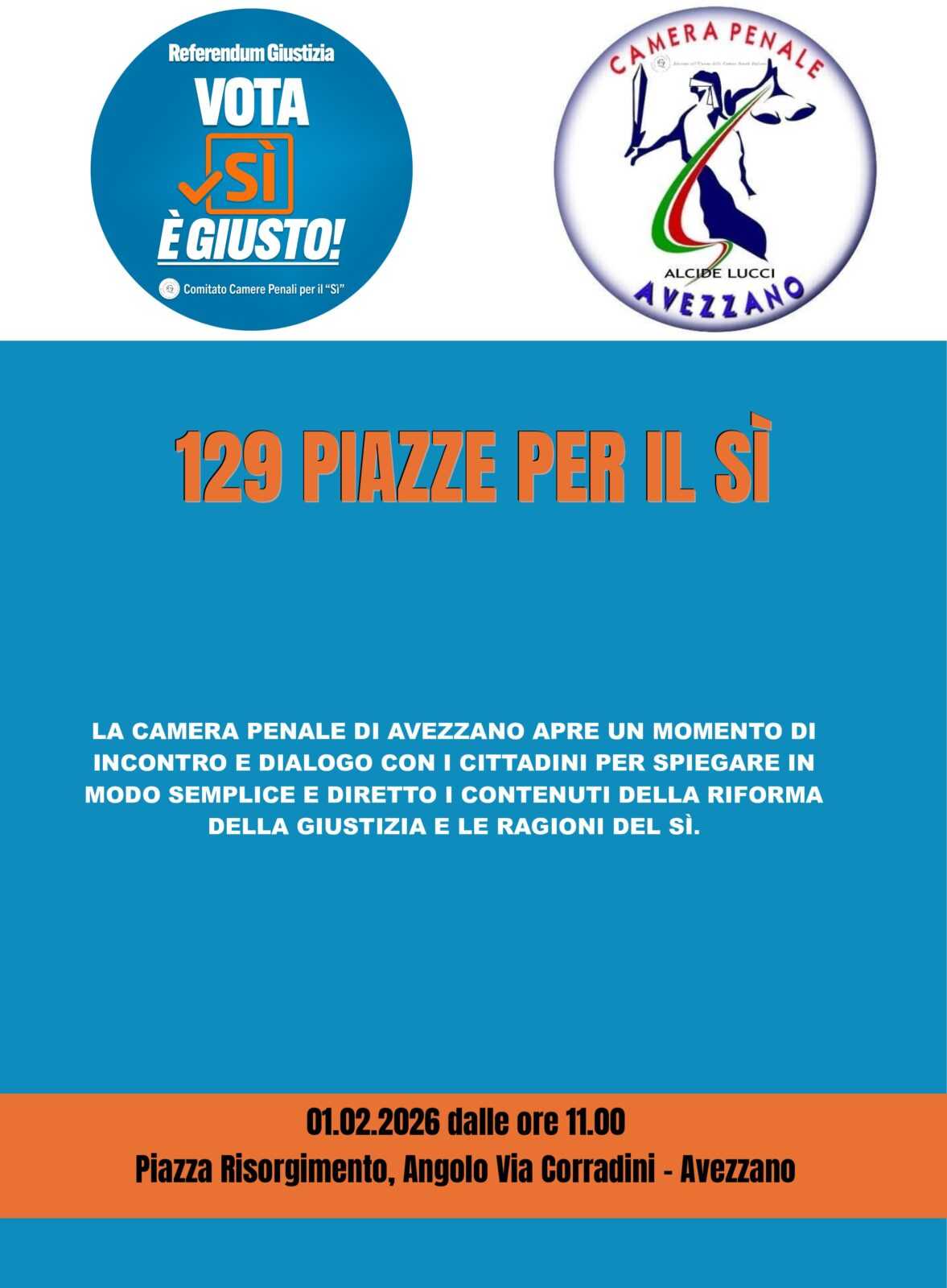 La Camera Penale “Alcide Lucci” di Avezzano, in rappresentanza del Comitato per il Sì dell’Unione delle Camere Penali Italiane, informa la cittadinanza che sabato 1 febbraio dalle 11 alle ore 13 sarà allestito un banchetto informativo in piazza Risorgimento, angolo Via Corradini ad Avezzano per promuovere il voto favorevole al Referendum sulla Giustizia.