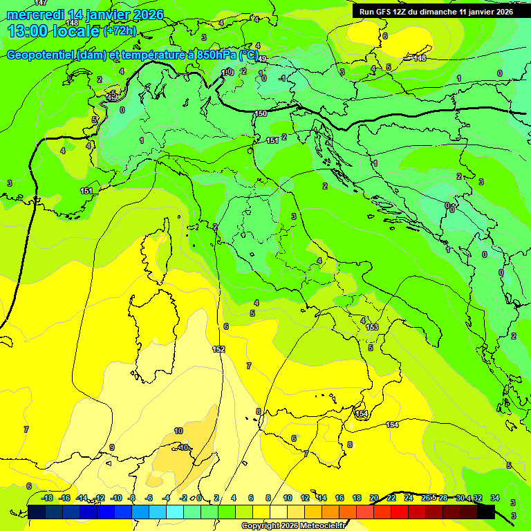 La situazione ad 850 hpa vista da GFS per le ore 13:00 di Mercoledì 14 Gennaio. Sulla Marsica condizioni di tempo discrete con il cielo che presenterà solo delle stratificazioni di passaggio e qualche locale addensamento sparso