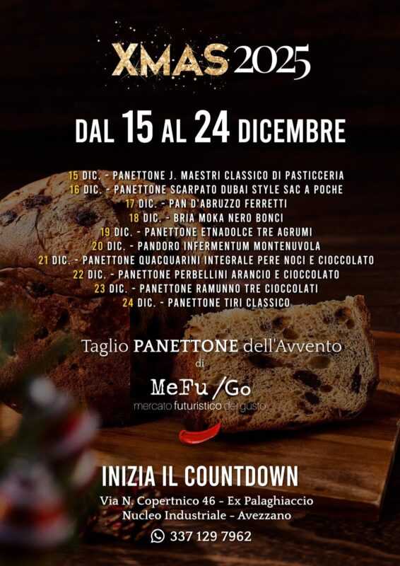MeFu/Go accende il Natale 2025 con la nuova edizione del “Taglio del Panettone dell’Avvento”, un percorso di degustazioni che dal 15 al 24 dicembre accompagna i visitatori dentro l’universo dei grandi lievitati italiani. (e non solo!) L’Ex Palaghiaccio di Avezzano si prepara a trasformarsi in uno spazio dedicato al gusto, dove ogni giornata propone un assaggio diverso e un racconto che parte dal prodotto per arrivare alla mano che lo ha creato.