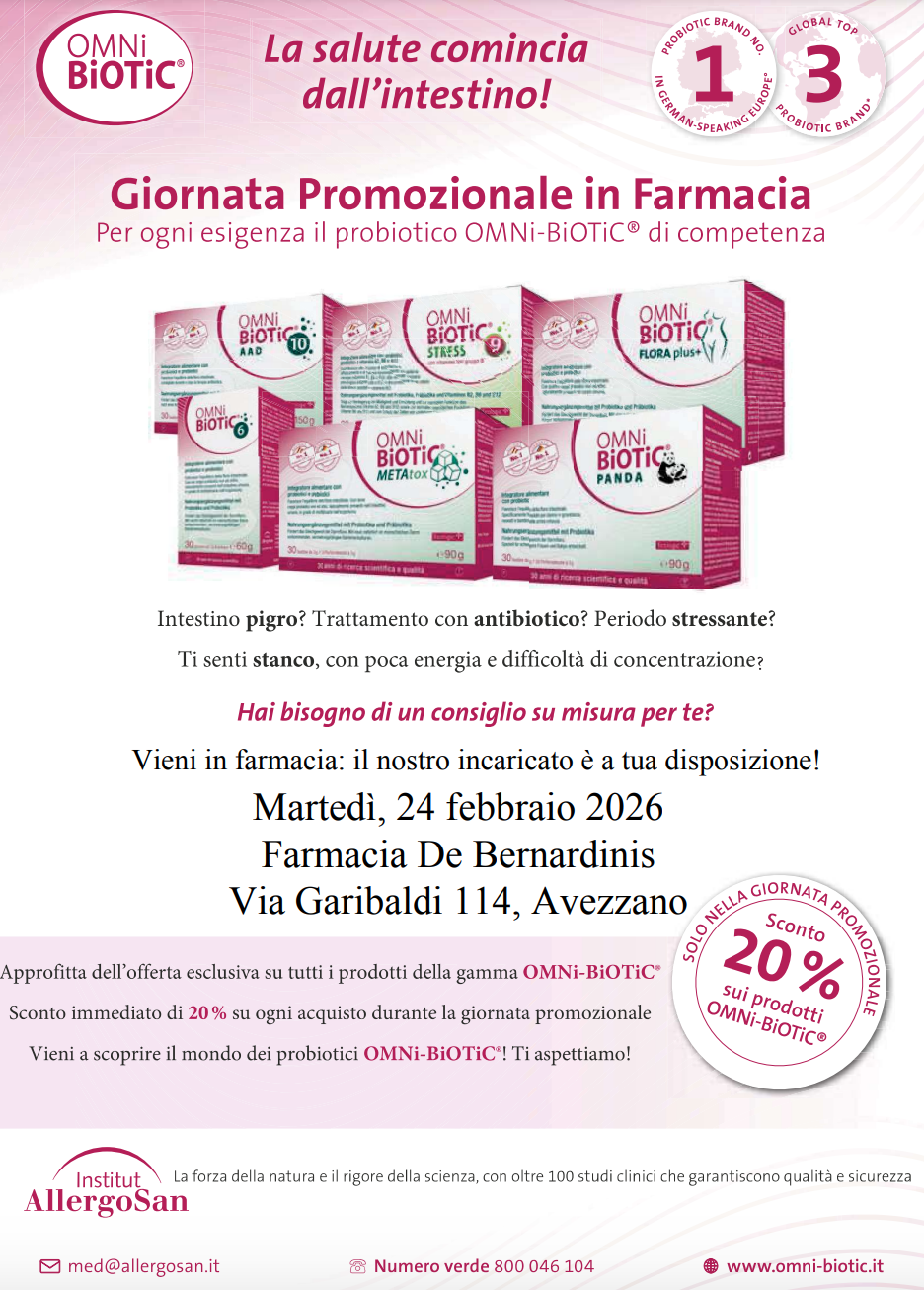 Oltre al momento informativo, la Farmacia De Bernardinis offre anche un’opportunità concreta: per la sola giornata di martedì 24 febbraio, tutti i prodotti della linea OMNi-BiOTiC saranno disponibili con uno sconto immediato del 20%.