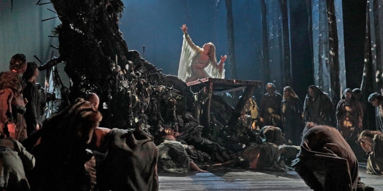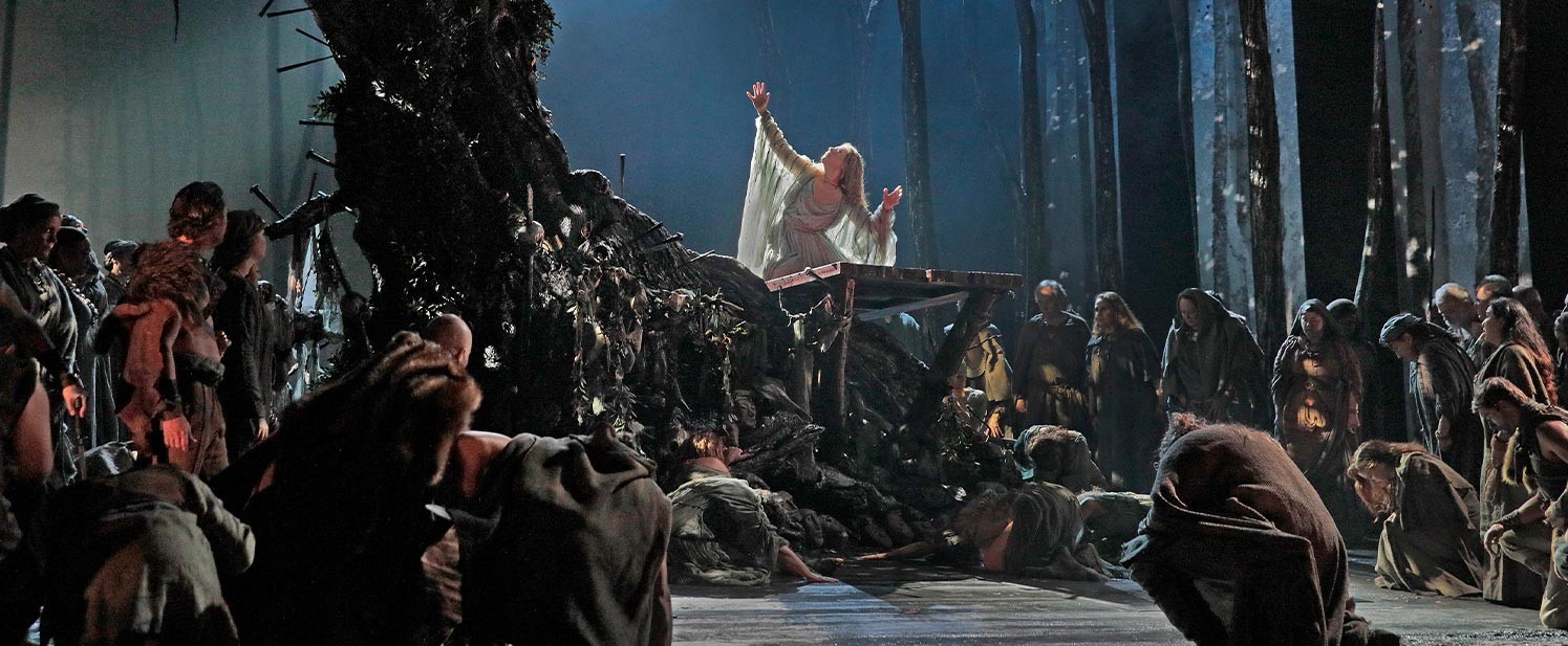 ATTO PRIMO La vicenda si svolge nelle Gallie, all’epoca dell’invasione Romana Nella foresta sacra dei Druidi il gran sacerdote Oroveso annuncia l’arrivo di Norma, la sacerdotessa sua figlia, che compirà il sacro rito in omaggio alla divinità lunare. Intanto Pollione, segreto amante di Norma da cui ha avuto due figli, incontra l’amico Flavio e gli confida di essersi innamorato di un’altra sacerdotessa (Adalgisa) e di voler con lei fuggire alla volta di Roma, temendo l’ira e la vendetta di Norma. I guerrieri Galli esortano Norma ed Oroveso a dare l’ordine di sterminare gli oppressori romani, ma Norma, quale interprete della volontà divina, asserisce che l’ora della rivolta non le è ancora stata comunicata dagli dèi. Intona quindi una preghiera alla luna, al termine della quale congeda l’assemblea dei Galli, che si allontana invocando il giorno della vendetta. Nella sacra foresta rimane solo Adalgisa, subito raggiunta da Pollione che la invita ad abbandonare le sue divinità e a seguirlo a Roma; la fanciulla, alfin convinta, promette di fuggire con lui l’indomani. Nella sua abitazione, Norma confida a Clotilde d’aver appreso che Pollione è richiamato in patria: teme che il proconsole abbia intenzione d’abbandonarla e le affida i due figli per poter rimaner da sola ma la raggiunge Adalgisa che, ignorando la relazione tra Norma e Pollione, le confida il suo colpevole amore senza rivelare l’identità dell’amato; narra il primo incontro e Norma commossa, al ricordo del suo idillio con Pollione, scioglie Adalgisa dai suoi voti e la congeda, invitandola a vivere liberamente con l’amato. All’arrivo inatteso del proconsole, Norma comprende che è proprio lui l’uomo amato dalla fanciulla ed in preda al furore, la mette in guardia contro l’infedeltà del romano. Adalgisa, sconvolta dalle rivelazioni, rimprovera Pollione di averla ingannata e rifiuta di seguirlo. I Druidi, intanto, richiamano Norma alla celebrazione dei sacri riti; Pollione si allontana, furente, e Adalgisa informa Norma che intende rinunciare al proprio amore.