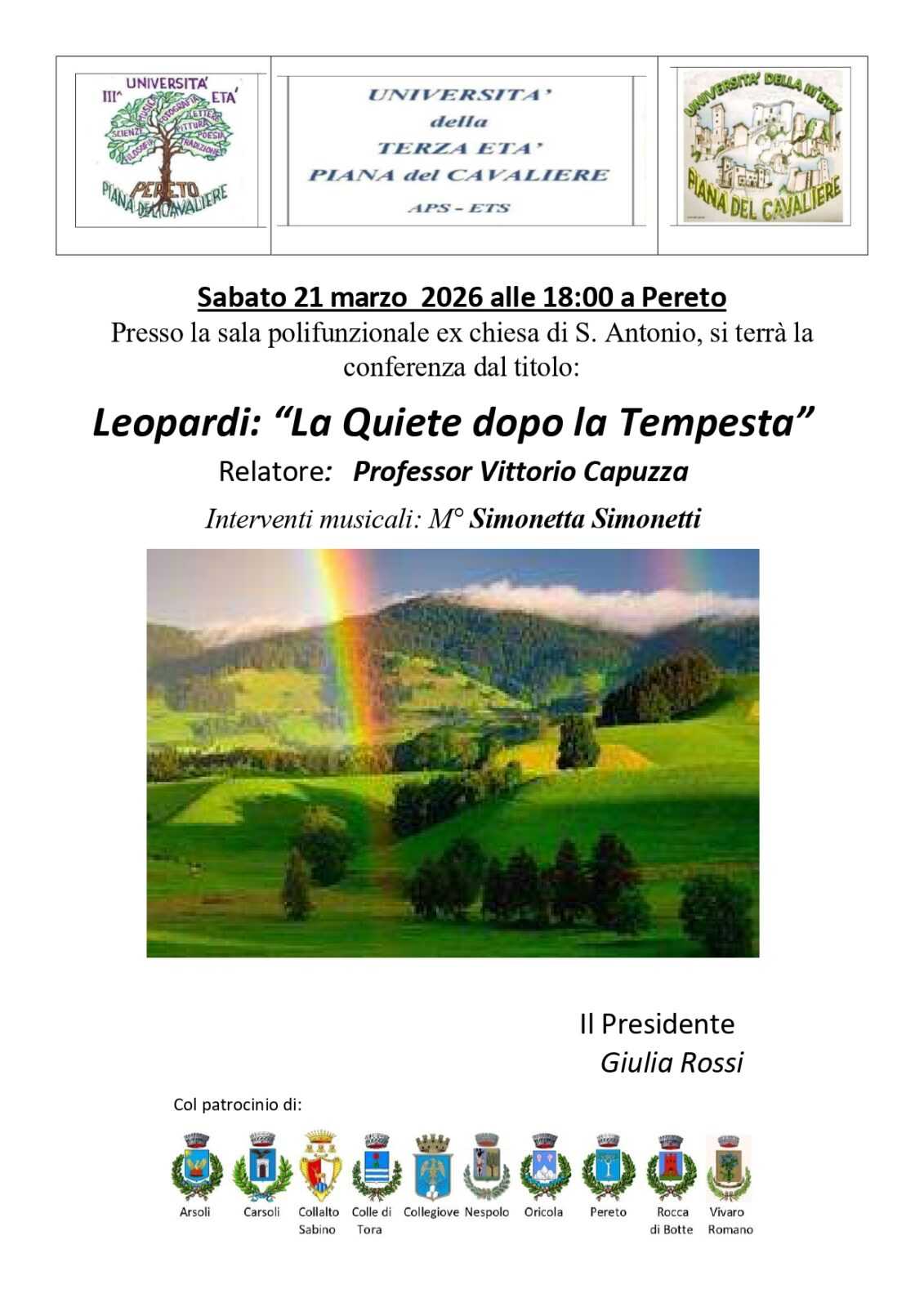 Il Comune di Carsoli è lieto di promuovere il prossimo appuntamento organizzato dall’Università della Terza Età “Piana del Cavaliere”.