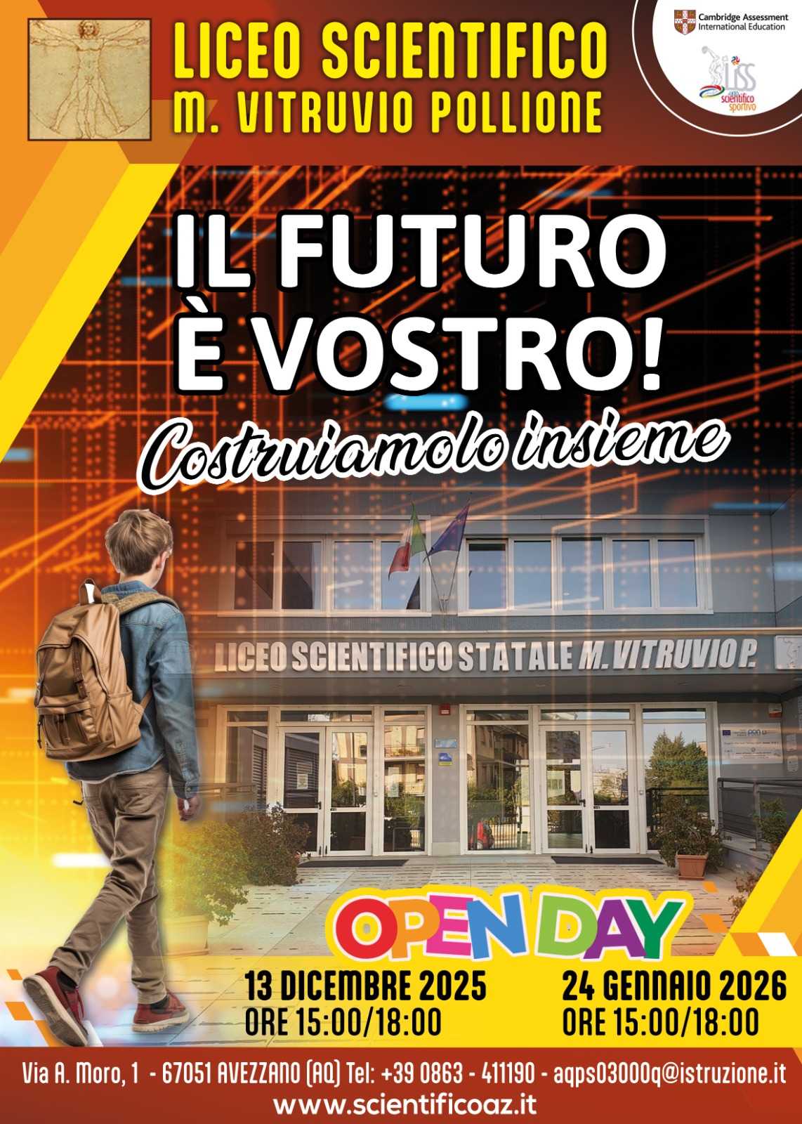 Avezzano. Tutto pronto al Liceo Scientifico “Vitruvio” per il secondo appuntamento con l’Open Day di sabato 24 gennaio.