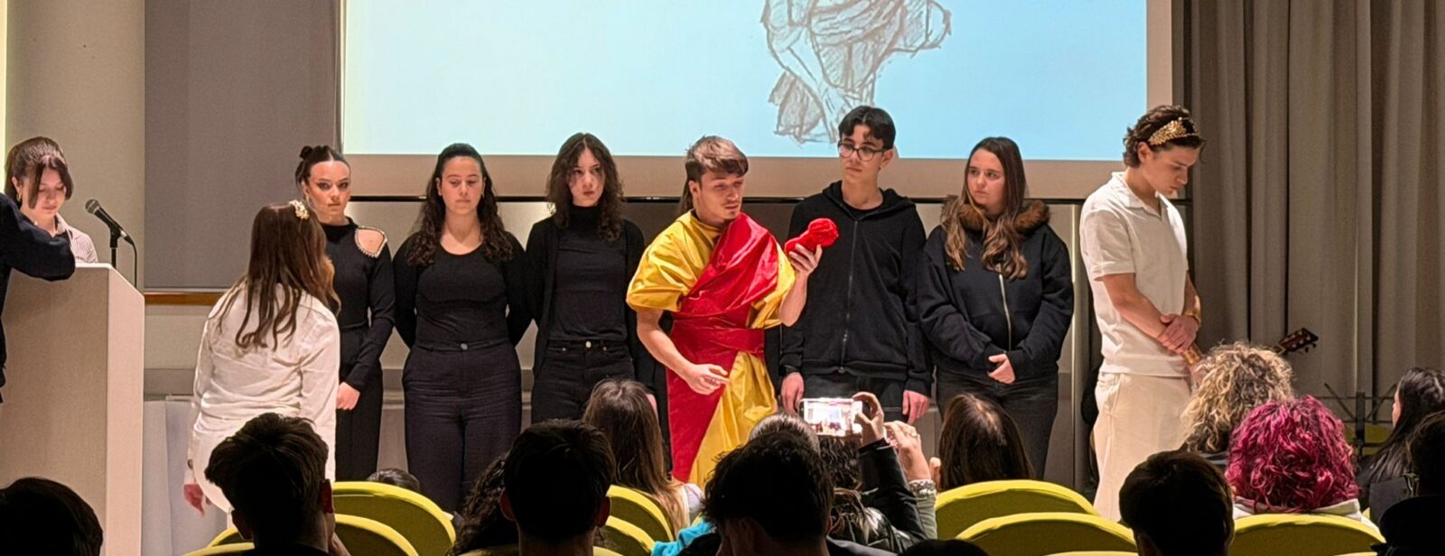 È stato importante unire più arti — recitazione, musica, coreografia, narrazione multimediale — perché il nostro obiettivo era mostrare la versatilità delle nostre competenze, che non si limitano ad ambiti rigidamente classici o esclusivamente scientifici. Combinare più skills ci ha permesso di creare un linguaggio espressivo più ricco, capace di coinvolgere diversi sensi e livelli di interpretazione. L’integrazione di arti diverse ha reso la performance più immediata, più emotiva e più vicina alla sensibilità contemporanea, permettendoci di attualizzare la mitologia e di renderla accessibile anche a chi solitamente non si avvicina ai miti antichi.