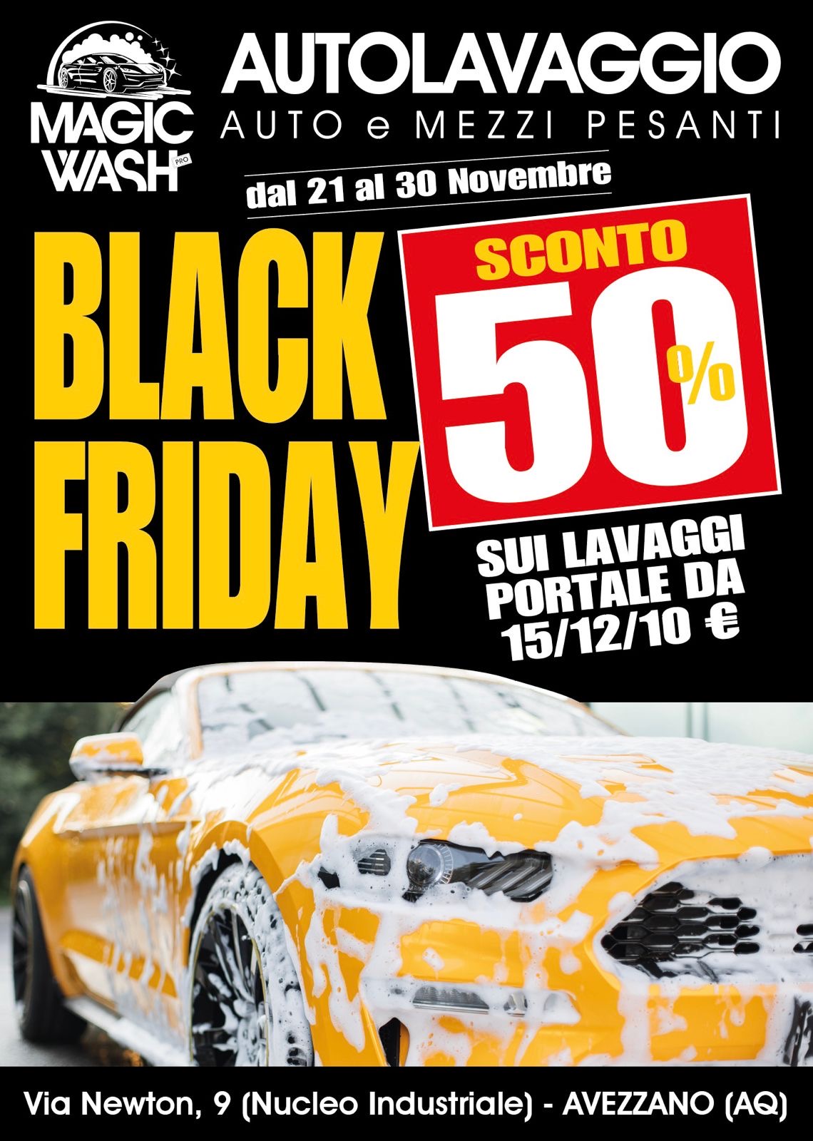In occasione del Black Friday anche ad Avezzano arrivano le offerte, ma questa volta non riguardano tecnologia o moda: al centro c’è la cura dell’auto. Magic Wash, l’autolavaggio del Nucleo Industriale, propone infatti una promozione valida dal 21 al 30 novembre con sconto del 50% sui lavaggi al portale da 15, 12 e 10 euro.