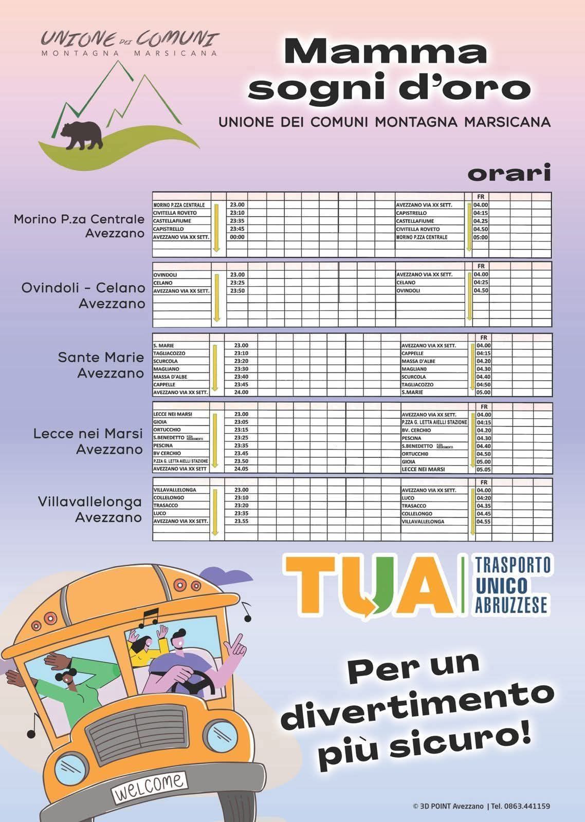 Avezzano. Prosegue anche questo fine settimana il progetto di mobilità sicura promosso dall’Unione dei Comuni Montagna Marsicana, che mette nuovamente a disposizione dei ragazzi della Marsica la navetta notturna gratuita nelle notti di sabato 6 e domenica 7 dicembre 2025.