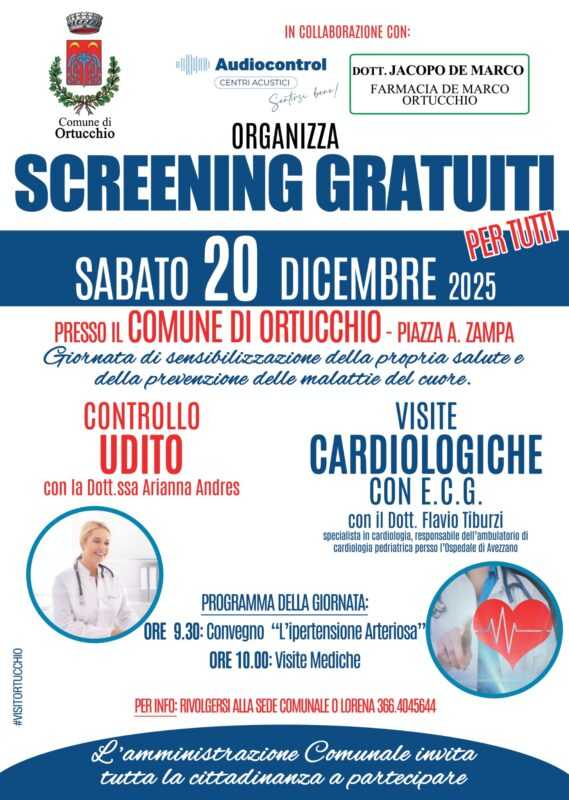 La prevenzione resta uno degli strumenti più efficaci per tutelare la salute, soprattutto quando consente di intercettare disturbi e patologie in una fase iniziale. In quest’ottica, sabato 20 dicembre, il Comune di Ortucchio ospiterà una giornata di screening gratuiti dedicata all’udito e alla salute cardiovascolare, aperta a tutta la cittadinanza.