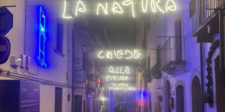 Pulsee Winter Lights, dopo le luminarie “Micro Macro” di Marcantonio nel dicembre 2024, torna con Fato, che ha creato per la stradina del “Capo Croce” pescasserolese una installazione che comprende, tra l’altro, su sei file luminose la frase al neon “La natura chiede alla pittura di non dimenticarla”. La citazione è una riflessione del filologo, traduttore e drammaturgo Gianni Garrera.