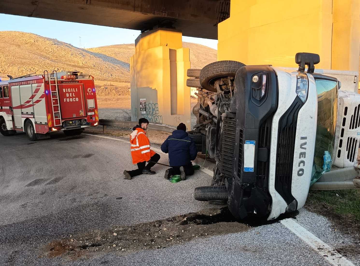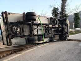 Il mezzo pesante si è ribaltato occupando parte della carreggiata. Non si registrano feriti.