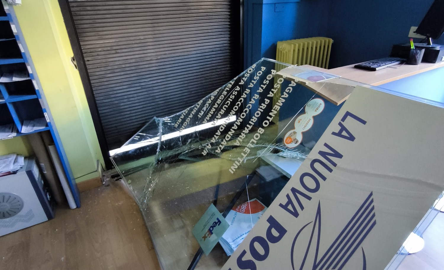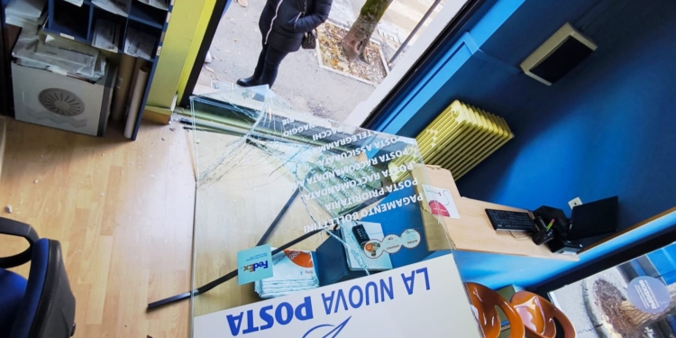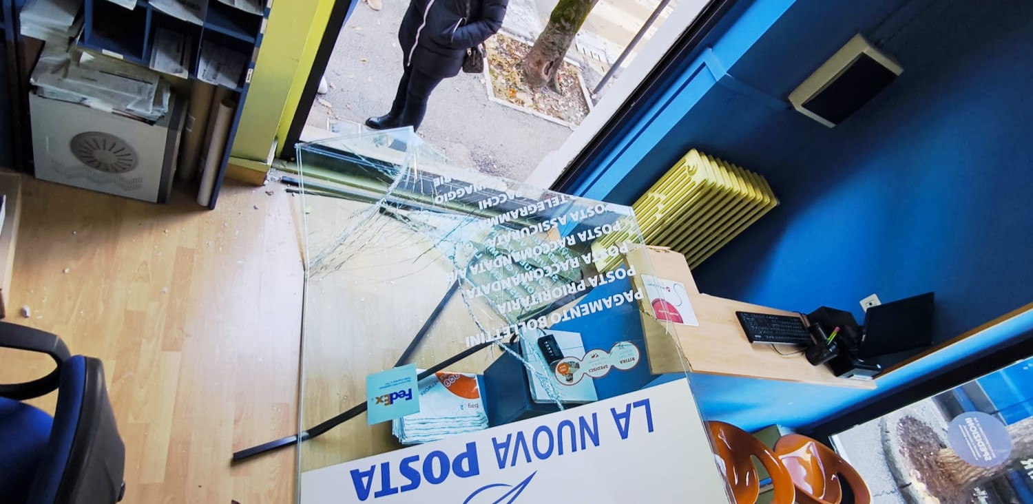Oltre al furto, sono ingenti i danni causati dall’irruzione, con la vetrata spaccata e materiale sparso ovunque.