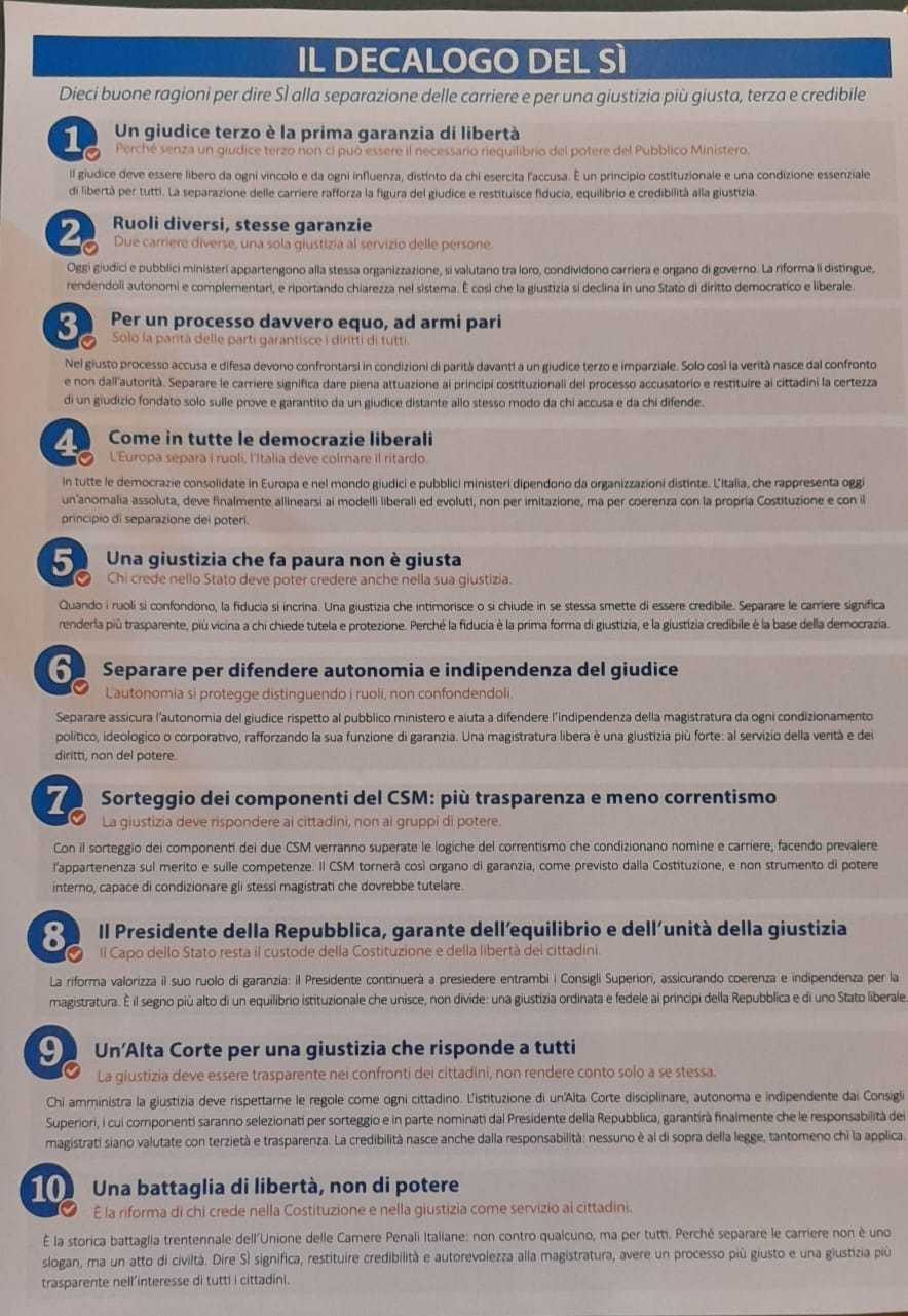 Nel corso dell’iniziativa, i penalisti hanno accompagnato i cittadini nella lettura e nella comprensione del decalogo del Sì, soffermandosi sui principi cardine della riforma: la separazione delle carriere tra giudici e pubblici ministeri, la garanzia di un giudice realmente terzo e imparziale, la parità delle armi nel processo, il rafforzamento dell’autonomia e dell’indipendenza della magistratura, fino ai temi della trasparenza, della responsabilità disciplinare e del superamento delle logiche correntizie all’interno del CSM.