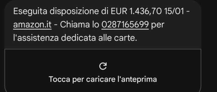 Il testo è breve, diretto e studiato per creare allarme: una transazione elevata, un marchio noto e la promessa di un supporto immediato. In realtà, dietro il messaggio non c’è né Amazon né un istituto bancario, ma un tentativo di frode.