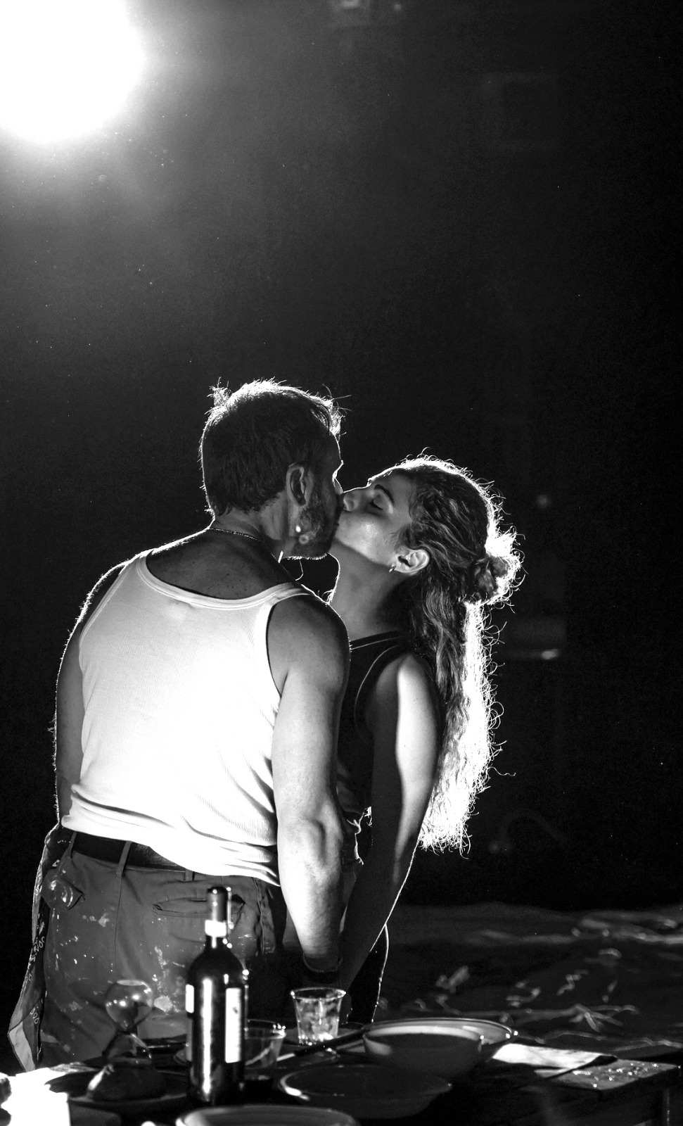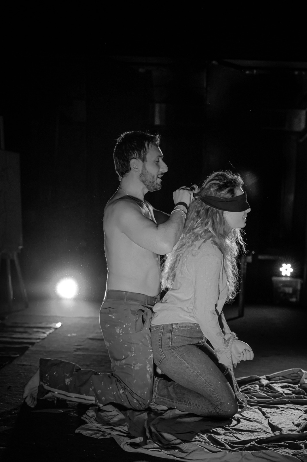 Avezzano. Un ambiente raccolto, due spazi distinti, fuori dal tempo e dal mondo: un tavolo e un nido fatto di lenzuola e passione. Due luoghi separati, dove cibo e sesso saziano i protagonisti, incorniciati da tele che vivono oltre la loro percezione. Solo lui può arrivarci: Manuela non ne ha visione, non ha accesso “all’arte”.