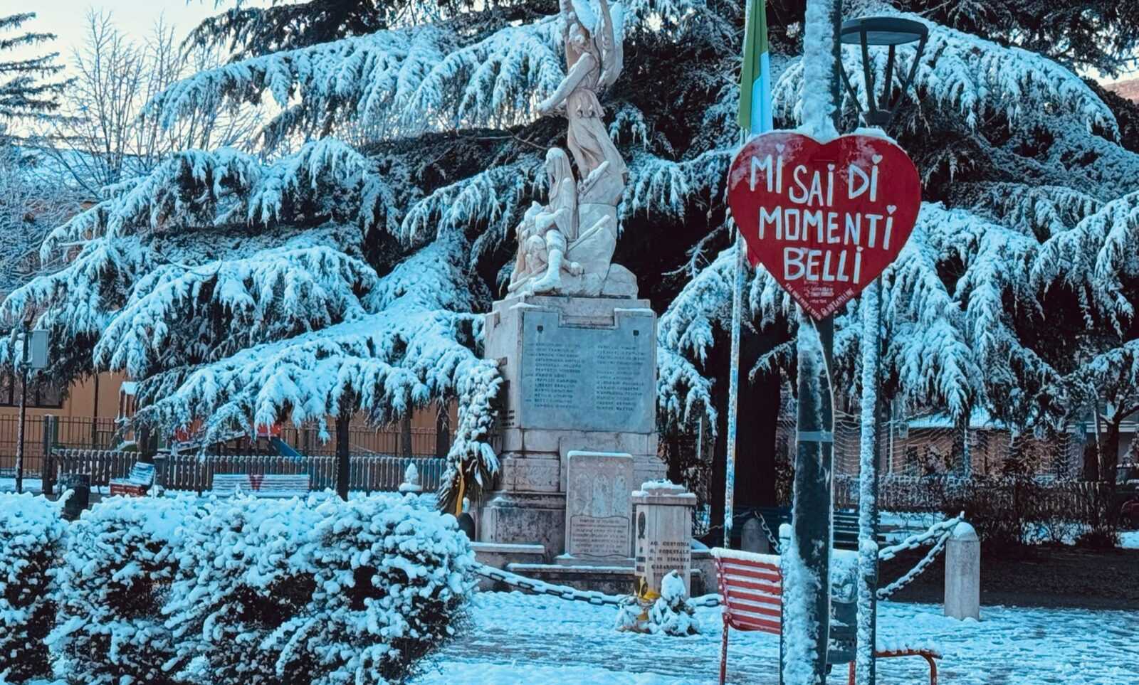 Al centro della scena, la statua dell’angelo emerge delicatamente dal bianco circostante, quasi a vegliare sul parco e su chi lo attraversa. Accanto, un cartello con la frase “Mi sai di momenti belli” diventa una dichiarazione silenziosa, un messaggio che sembra rivolgersi non solo al luogo, ma anche a chi osserva la fotografia. Parole semplici, ma potenti, che si fondono con l’atmosfera invernale e aggiungono un tocco di magia e romanticismo allo scatto.
