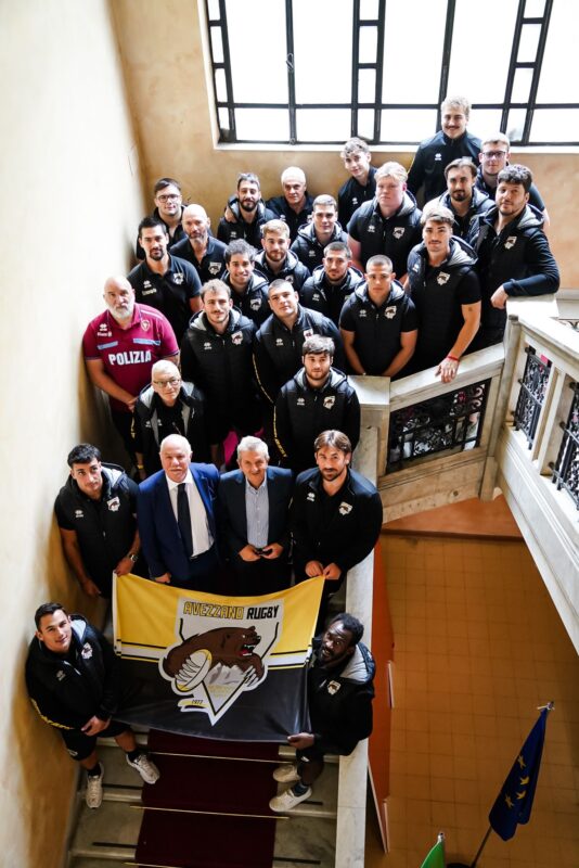 Avezzano. Sulla scalinata di Palazzo di Città, il tempo sembra fermarsi per un istante: al centro il sindaco Giovanni Di Pangrazio, attorno gli atleti dell’ISWEB Avezzano Rugby, pronti per la prima di campionato. Maglie giallonere, sorrisi, spalle dritte. È l’immagine simbolo di una mattinata che ha intrecciato sport, arte e urbanistica in un racconto unico: quello di una comunità che continua a spingere, a costruire, a crederci.