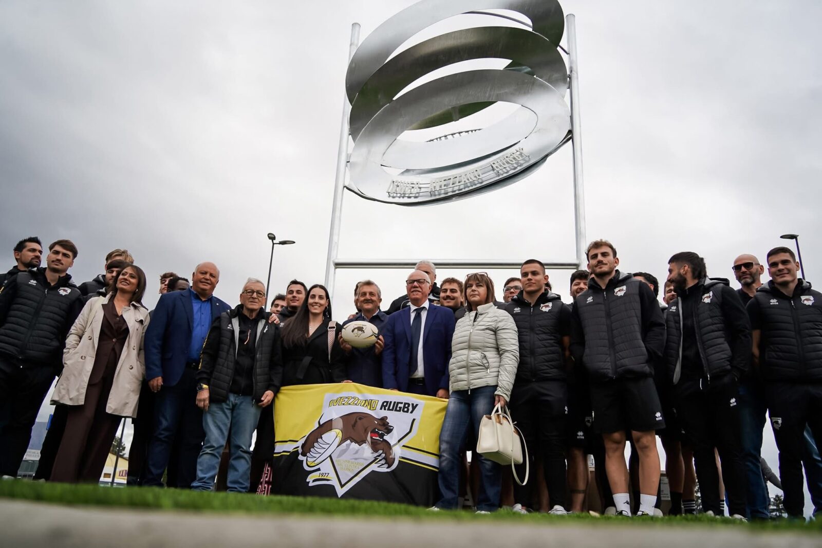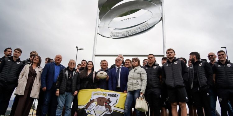 A tagliare il nastro, insieme al sindaco Di Pangrazio, il presidente della squadra che ha donato l’installazione artistica Alessandro Seritti, la consigliera delegata al quartiere Federica Collalto, l’assessore regionale Mario Quaglieri, il consigliere regionale Massimo Verrecchia, il presidente del CONI Abruzzo Antonello Passacantando, il main sponsor Alessandro Bianchi, il consigliere FIR Antonio Lusi, il presidente del comitato Rugby Abruzzo Marco Molina, l’allenatore Pierpaolo Rotilio, l’intera amministrazione comunale che, però, lascia il posto d’onore al consigliere di minoranza Mario Babbo, con una storia da atleta giallonero.