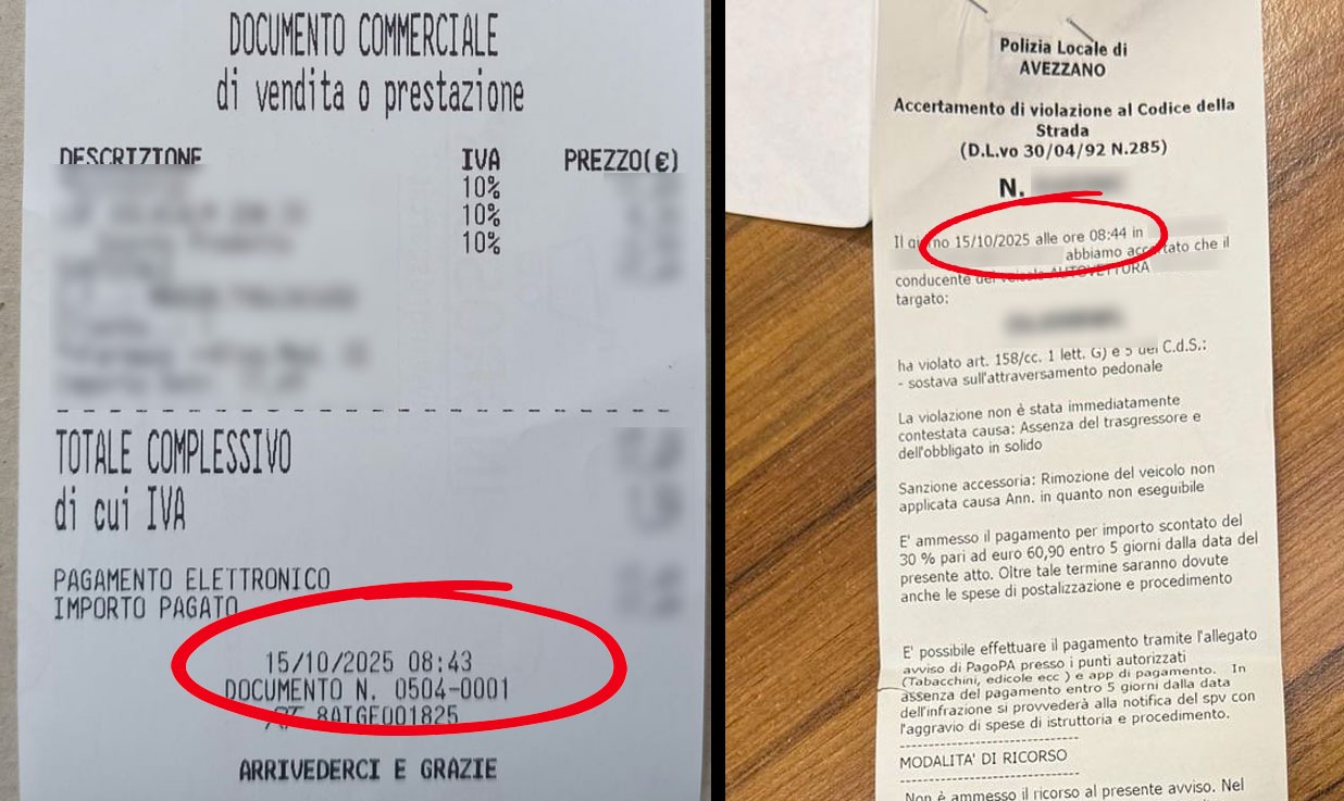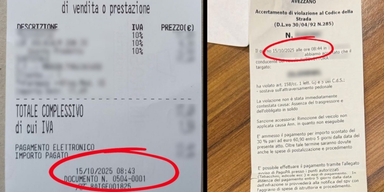 È successo ieri mattina fuori una farmacia del centro. Il tempo di entrare, pagare e uscire, e sul parabrezza era già comparso il verbale della Polizia Locale. La donna ha provato a giustificarsi, mostrando l’ora sullo scontrino della farmacia e quello sulla multa, separati da appena un minuto di differenza (le 8:43 e le 8:44), eppure gli agenti, ancora sul posto, non hanno voluto ascoltare spiegazioni.
