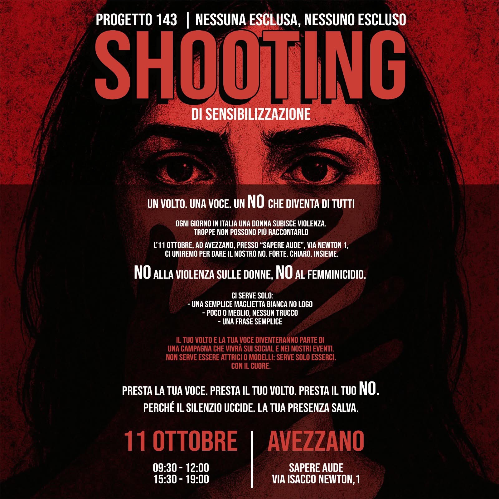 Avezzano. Ogni giorno in Italia una donna subisce violenza. Troppe non possono più raccontarlo. Per dare voce a chi non ne ha più, il Progetto 143 promuove un’iniziativa di sensibilizzazione forte e simbolica: uno shooting collettivo aperto a tutti, in programma domani, sabato 11 ottobre presso “Sapere Aude”, in via Newton 1 ad Avezzano, dalle 9:30 alle 12:00 e dalle 15:30 alle 19:00.