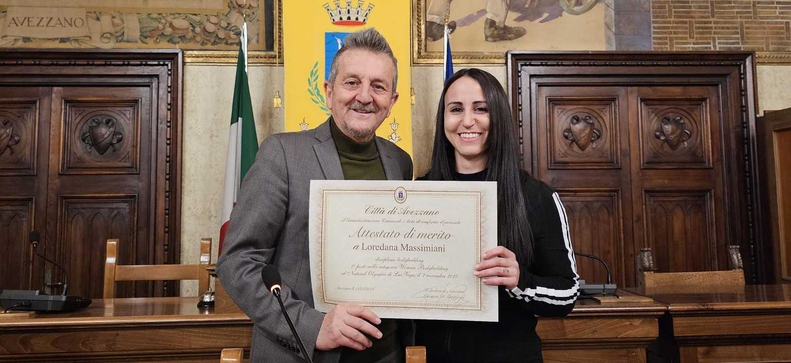 Mercoledì pomeriggio, nella sala Consiliare del Municipio, si è svolta la cerimonia di premiazione dell’atleta Loredana Massimiani che ha conquistato il 1° posto nella categoria Woman Bodybuilding al Natural Olympia di Las Vegas lo scorso 7 novembre 2025. Un’ambasciatrice internazionale dello sport dalla Marsica agli Usa, Loredana, già biologa e nutrizionista, ha ottenuto anche il riconoscimento di atleta professionista in due categorie ed ha trionfato in diverse gare europee, come quella di Lisbona sempre nel 2025. Ieri quindi, un’emozionante cerimonia di consegna dell’attestato di Benemerenza per i risultati conseguiti alla quale hanno partecipato il Sindaco Gianni Di Pangrazio, l’assessore allo Sport, Pierluigi Di Stefano, il consigliere Ignazio Iucci, i familiari e gli amici di Loredana e Lorenzo De Cesare, già assessore del Comune di Avezzano e proprietario della FiveZone, centro sportivo dove si allena la bodybuilder avezzanese.